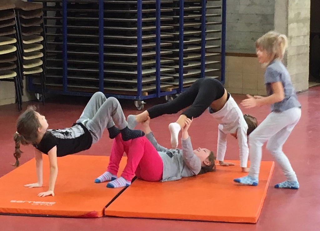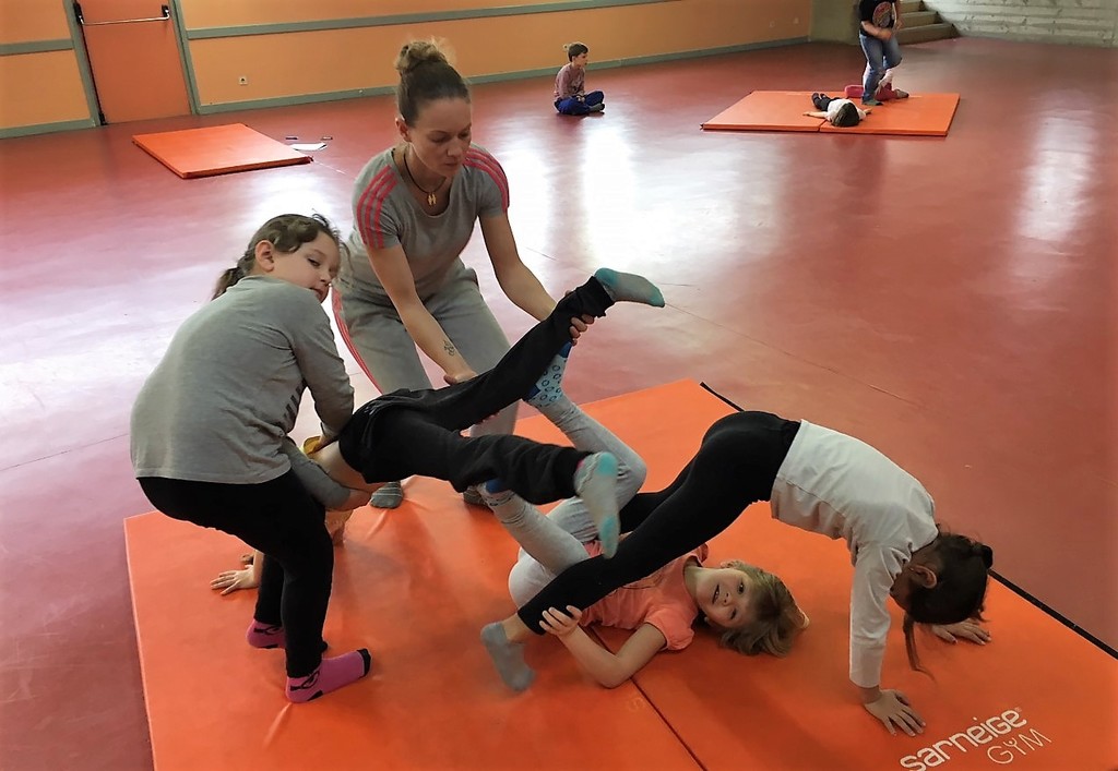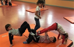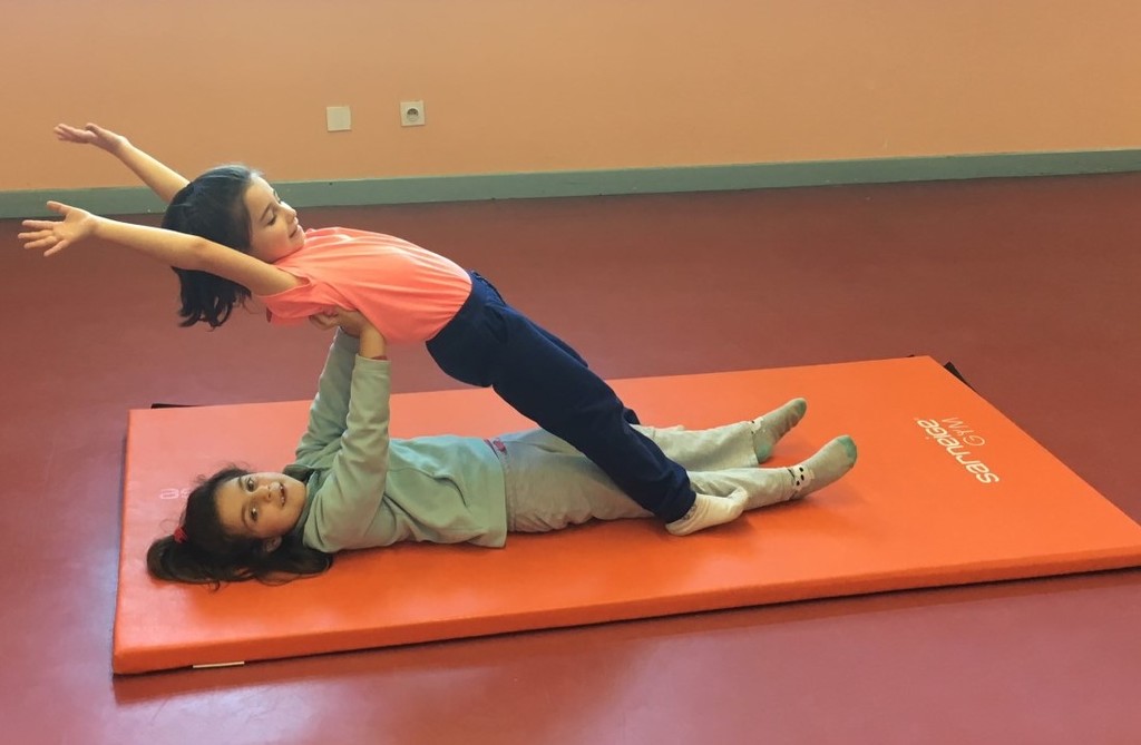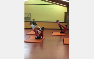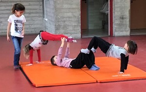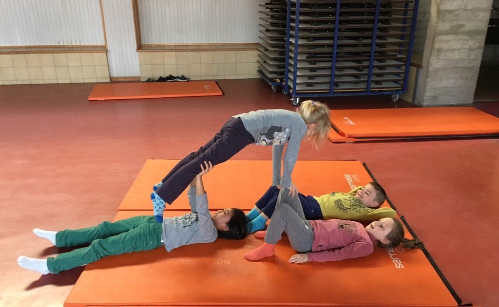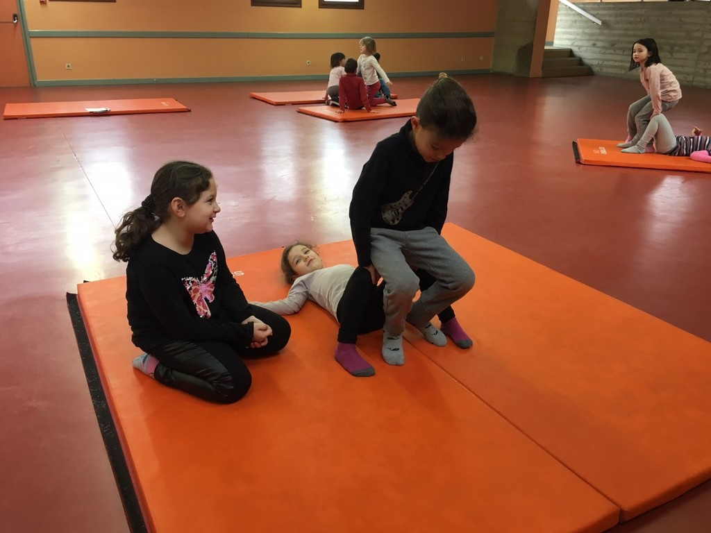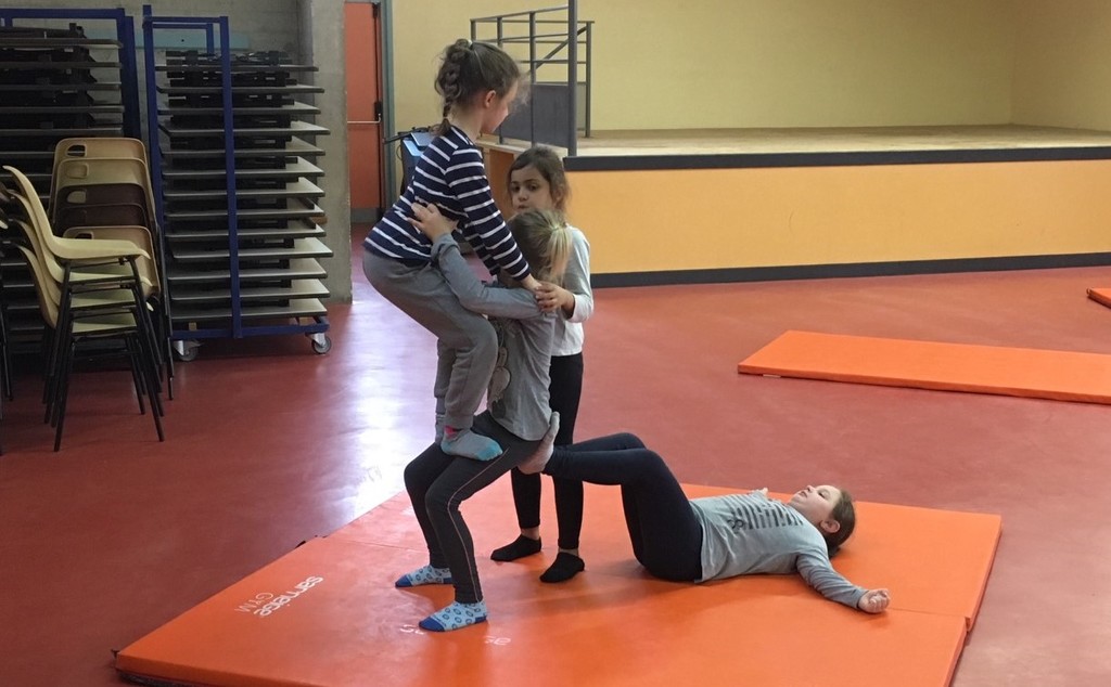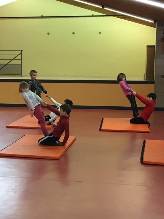 Les enfants des deux classes de l'école de Moras en Valloire en pleine initiation à la Gymnastique Acrobatique. Les élèves ont bénéficié d'une séance par semaine lors d'un cycle du 2e trimestre.