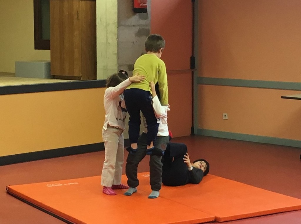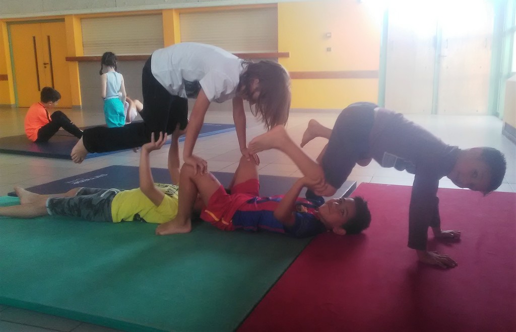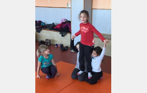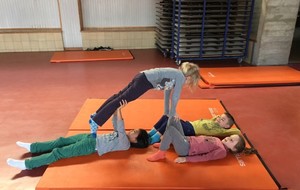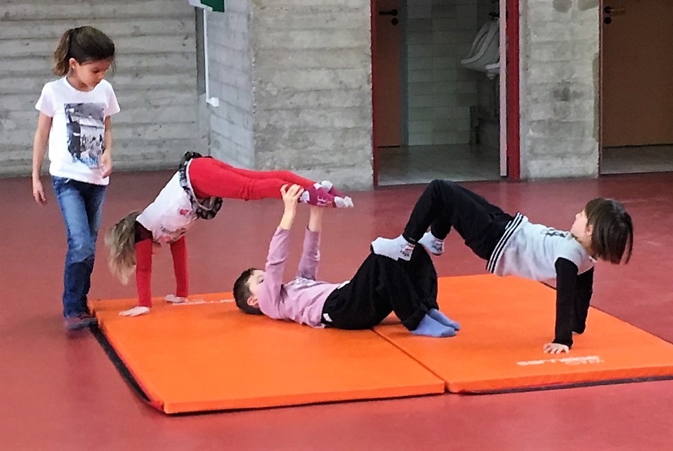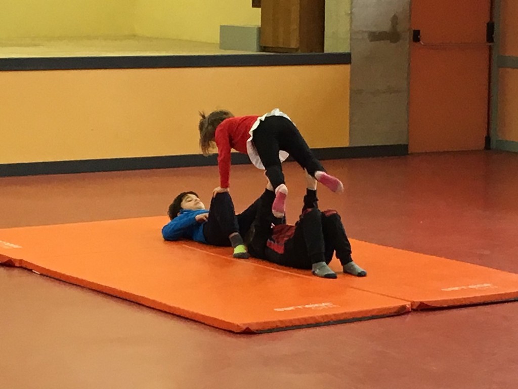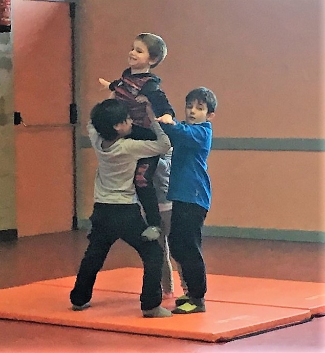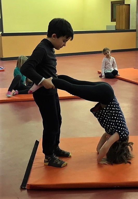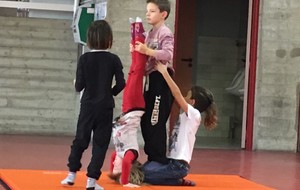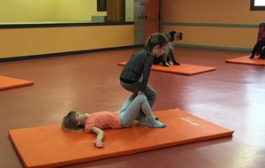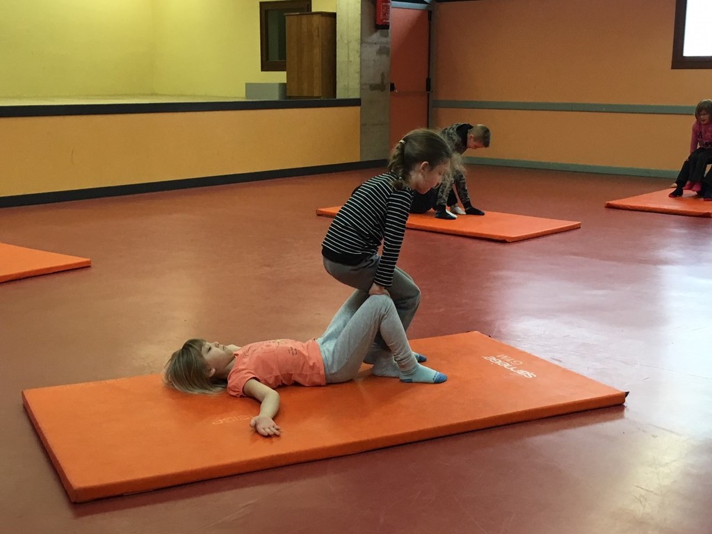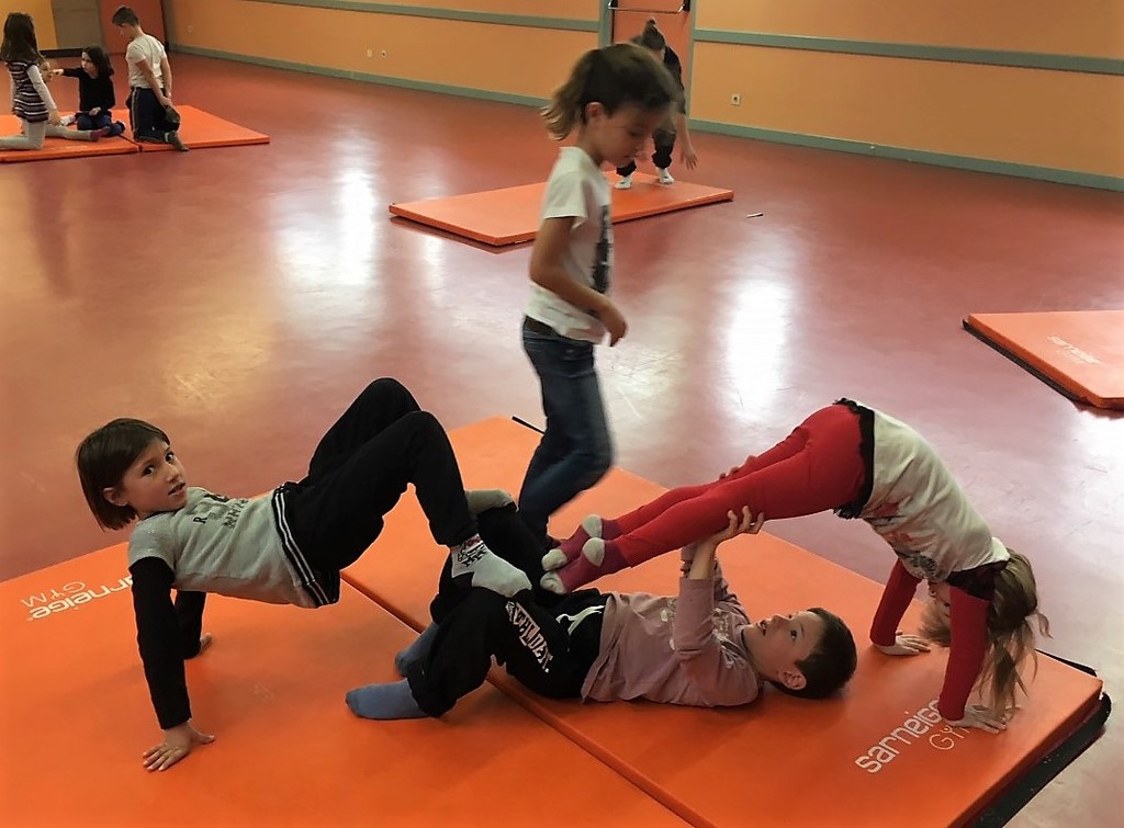 Les enfants des deux classes de l'école de Moras en Valloire en pleine initiation à la Gymnastique Acrobatique. Les élèves ont bénéficié d'une séance par semaine lors d'un cycle du 2e trimestre.